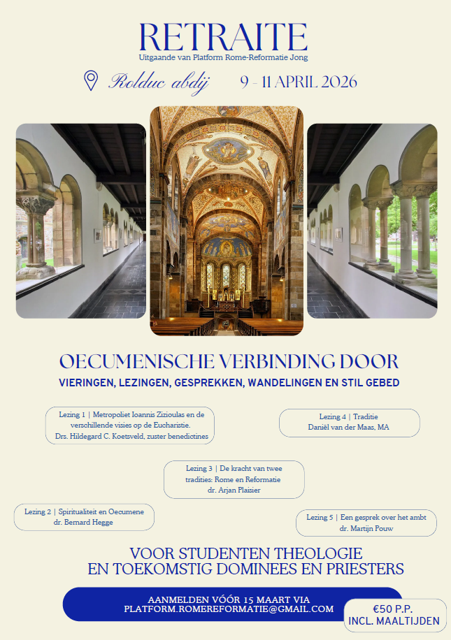 Oecumenische verbinding door vieringen, lezingen, gesprekken, wandelingen en stil gebed. Retraite van 9-11 april 2026 in abdij Rolduc voor theologiestudenten en toekomstige dominees en priesters. Prijs: €50, incl. overnachtingen en maaltijden.