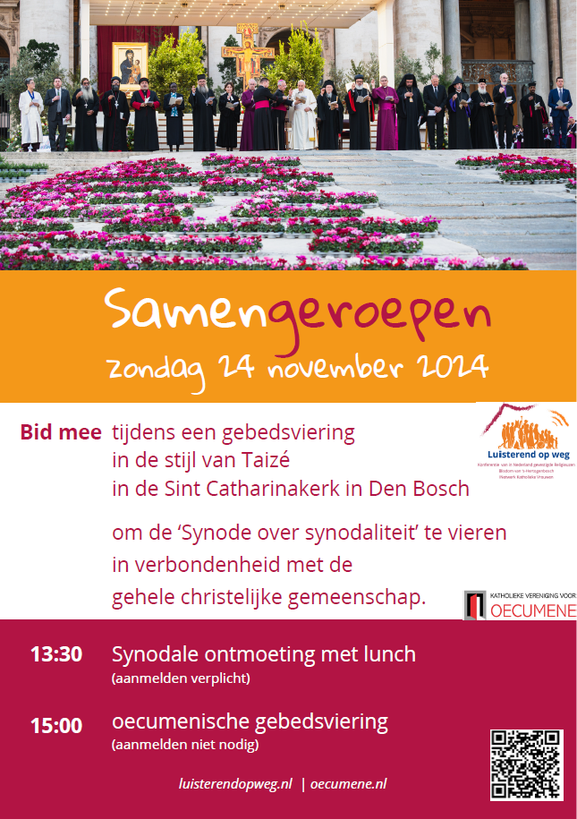 Bij de start van de eerste zitting van de synode vond op 30 september 2023 op initiatief van Taizé en op uitnodiging van Paus Franciscus een oecumenisch avondgebed plaats op het Sint-Pietersplein, genaamd ‘TOGETHER: samenkomst van Gods Volk’. Wetend dat we geroepen zijn als christenen samen op te trekken bouwt het gebed op 24 november dankbaar voort op dat mooie initiatief, dat een diepe indruk gemaakt heeft.