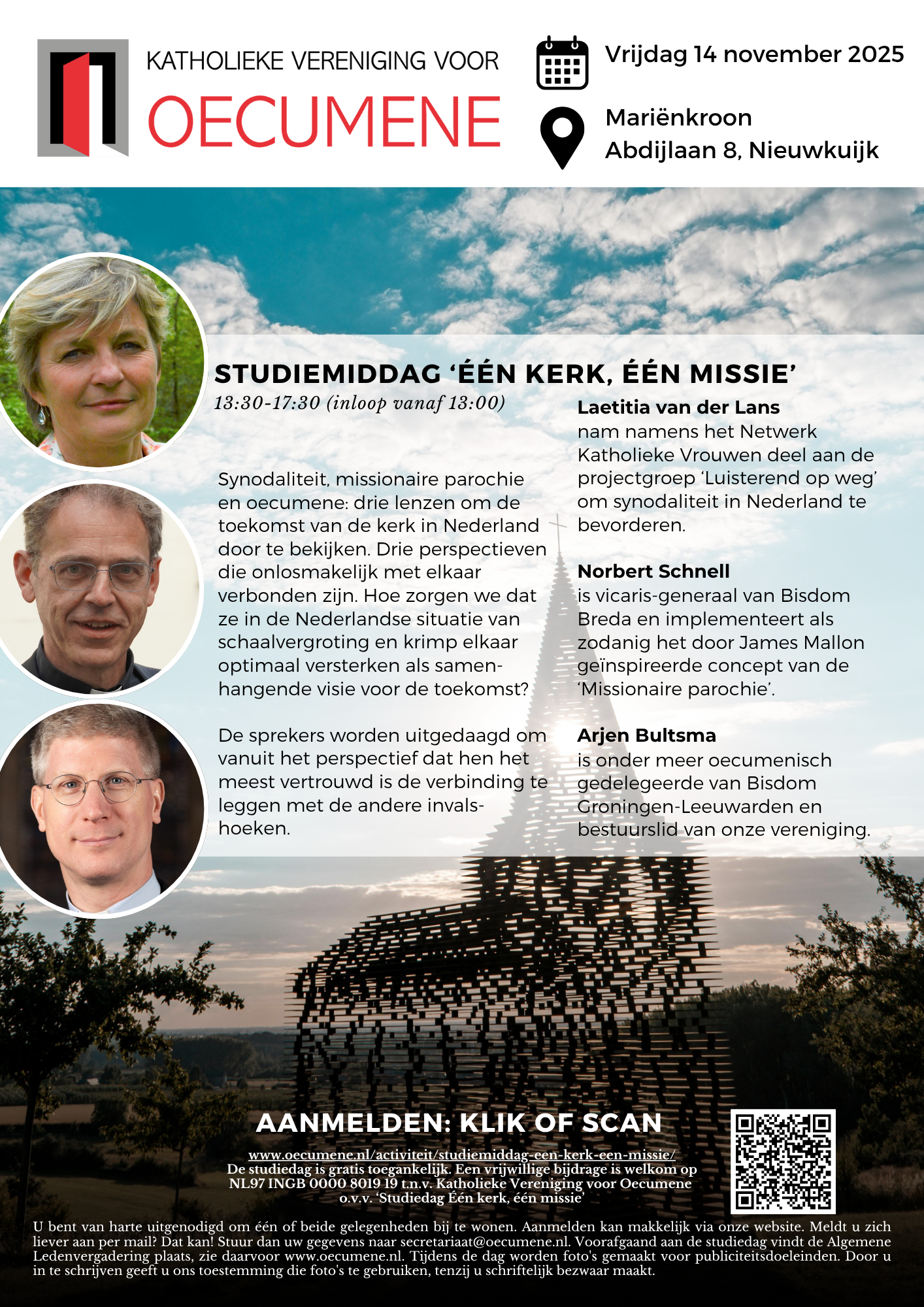Het is de overtuiging van de Katholieke Vereniging voor Oecumene, en zij weet zich hierin gesterkt door paus Franciscus en paus Leo XIV, dat oecumene en missie bij elkaar horen en dat beiden als zijden van dezelfde medaille geïntegreerd zijn in het overkoepelende concept van de synodaliteit. Daarom is een reflectie op de samenhang tussen deze perspectieven nuttig. Het doel van deze studiedag is om de drie perspectieven samen te brengen: hoe kunnen ze elkaar versterken in de inzet voor parochievernieuwing, met het oog op een levend christelijk getuigenis in onze samenleving? De sprekers worden uitgedaagd om vanuit het perspectief dat hen het meest vertrouwd is de verbinding te leggen met de andere invalshoeken.