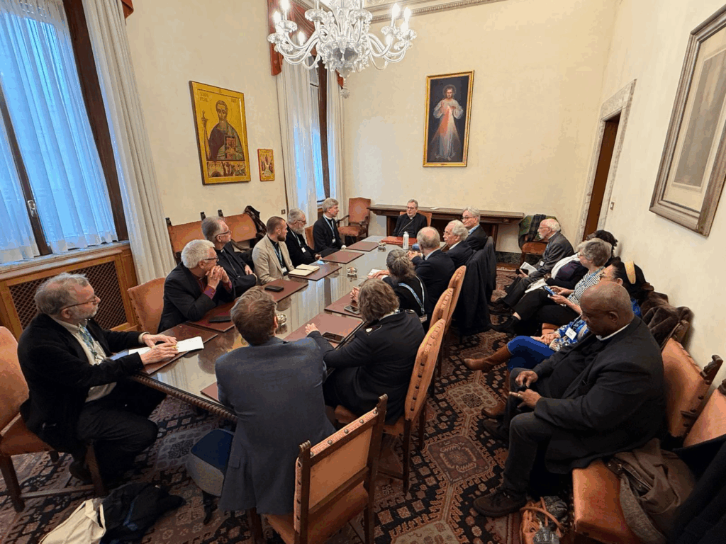 Na de foto gaan we in rap tempo richting de Dicasterie van de Oosterse Kerken, waarbij we de koffie maar overslaan. Heel erg is dat niet, want we zijn nog vol van het gebeuren. Bij de dicasterie worden we hartelijk ontvangen door kardinaal Claudio Gugerotti. Na een voorstelrondje vraagt de kardinaal belangstellend naar de Nederlandse situatie en waar we in de oecumene mee bezig zijn. De instabiele politieke situatie en de groeiende belangstelling van jongeren voor het geloof worden herkend door de kardinaal. Op zijn beurt schetst de kardinaal de situatie van de geünieerde of oosters-katholieke kerken wereldwijd. Deze kerkgemeenschappen behoren volledig bij de Katholieke Kerk onder het gezag van de paus, maar hebben een eigen wetboek. Ze zijn vaak heel klein en arm en er zijn nauwelijks genoeg ambtsdragers. Door oorlogen ontvluchten veel oosters-katholieken hun land.