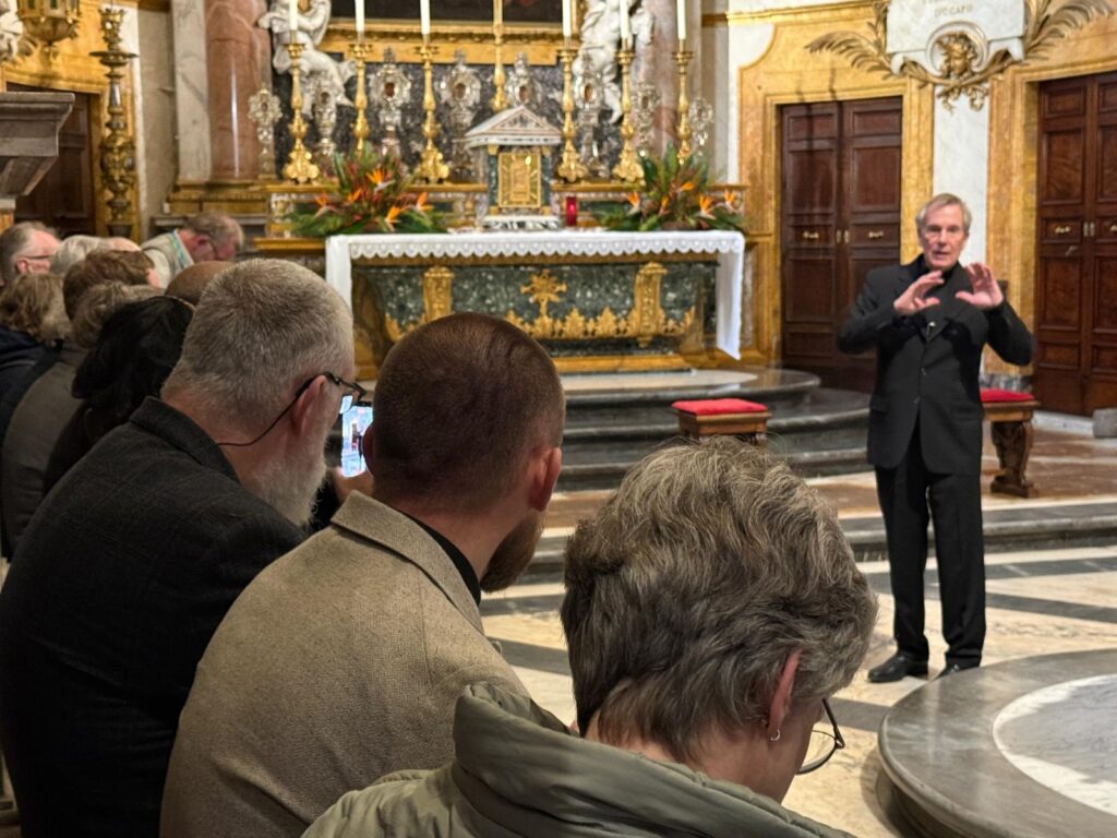 We maken een stevige wandeling naar het restaurant voor een lunch en gaan aansluitend naar de Santa Maria d’Anima, waar de enige Nederlandse paus begraven ligt: paus Adrianus VI (1459-1523). Een bekende Nederlander, Antoine Bodar, ontvangt ons in deze prachtige kerk. Er is niet veel oecumenisch aan deze kerk, aldus Bodar, maar wel veel Europees. Het complex is in 1350 door een echtpaar uit Dordrecht gesticht vanwege het tweede Heilig Jaar (’t eerste was in 1300). Het huis en de kerk waren nauw verbonden met het Heilig Roomse Rijk en de Habsburgers. Zo is de relatie met de Lage Landen. Voor de Nederlanders is met name het graf van paus Adrianus VI (1459-1523) van belang. Hij kwam uit Utrecht, was in Zwolle opgeleid, studeerde in Leuven, woonde in Brussel, later in Spanje en werd in 1522 tot paus verkozen. Adrianus – die maar kort paus geweest is – heeft aan het einde van zijn leven wel het allereerste begin van de reformatie meegemaakt.