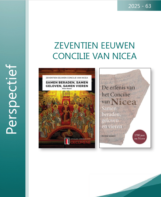 In 2025 herdenken kerken samen het Concilie van Nicea (325). Op 8 november 2024 hield de Katholieke Vereniging voor Oecumene in Oss een studiemiddag n.a.v. de publicatie van het boekje van prof. dr. Peter Nissen: Samen beraden, samen geloven, samen vieren: Zeventien eeuwen concilie van Nicea. Nissen schreef dit boekje in opdracht van de KVO, met als doel het faciliteren van het gesprek over Nicea in parochies en gemeenten. Het is in open access beschikbaar en in licht uitgebreide vorm is het inmiddels ook verschenen bij uitgeverij Adveniat. Dit nummer van Perspectief biedt de reacties op het boekje van Nissen van ds. Renate Japenga, dr. Arjan Plaisier en dr. Martijn Pouw.
